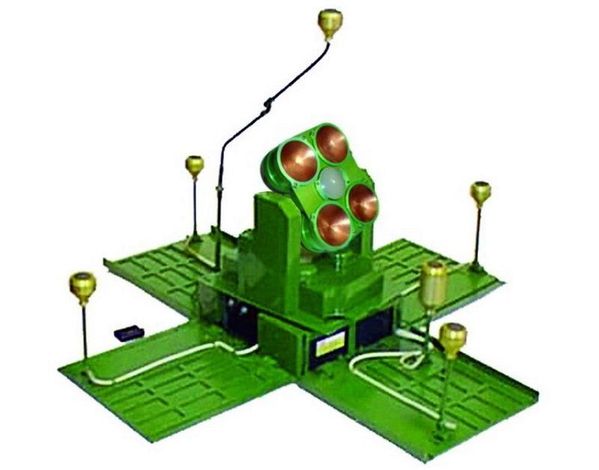 На средней части коробки закреплены боевая часть и система обнаружения, которые вращаются вокруг своей оси на 360 градусов и вертикально на 180 относительно плоскости поверхности.