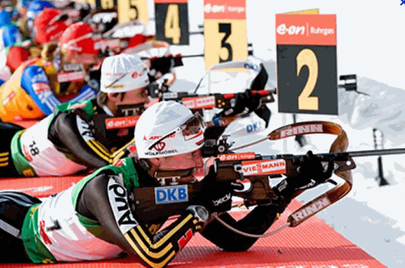 Биатлон — входит в состав олимпийских видов спорта, в который включены гонка на лыжах и стрельба из винтовки. Для стрельбы используются винтовки, весят они 3,5 кг. Во время гонки эти винтовки спортсмен переносит на спине. По команде судьи участники гонки стартуют. Пройдя определенную дистанцию, каждый спортсмен стреляет по 5-ти мишеням.